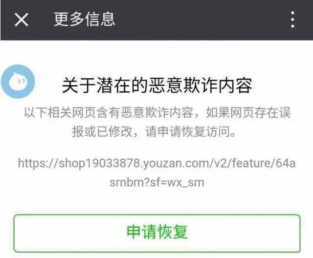 无独有偶,国内也有一家公司最近正在因为同类事情而挠头,相信有些人已经听说了,有赞在昨天下午两点多的时候被微信误伤到了,很多使用有赞搭建的微商城都无法访问,提示:“因含有恶意欺诈内容而被屏蔽”。有赞因为这个事情还专门发布了一个公告。这距有赞借壳上市还不足半个月时间,而根据上市过程公布的投资数据预计,有赞的估值在41亿港币左右。