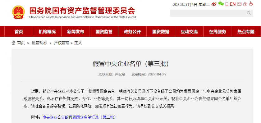 国务院国资委2021年和2022年已两次对“假央企”和“伪国企”进行集中公示,今年早些时候,国务院国资委公布第三批假冒“央企”295家名单,明确表示,假冒国企与中央企业无任何隶属或股权关系,也不存在任何投资、合作、业务等关系,其一切行为均与中央企业无关。请社会各界提高警惕,注意防范风险,如发现其违法犯罪行为,请尽快到公安机关报案。